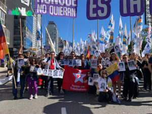A manifestação do dia 24 indica não querer silenciar mais. A sensação é de que a sociedade percebe que falta pouco para um salto da repressão econômica e social a uma repressão política violenta e massiva aos direitos humanos e democráticos. Tudo se torna mais preocupante no contexto mundial de guerra. Sobretudo sob um governo que minimiza que as “Malvinas são argentinas”, e que 649 combatentes compatriotas, recrutados com menos de 20 anos, foram mortos na guerra contra a Inglaterra. Com esses antecedentes, o presidente atual pretende, sem consulta parlamentar, nem popular, envolver o país numa guerra, visivelmente rechaçada pelos povos do mundo. Os 8 milhões de cidadãos norte-americanos nas ruas do EUA abalaram o promotor da guerra: “Não ao Rei!”